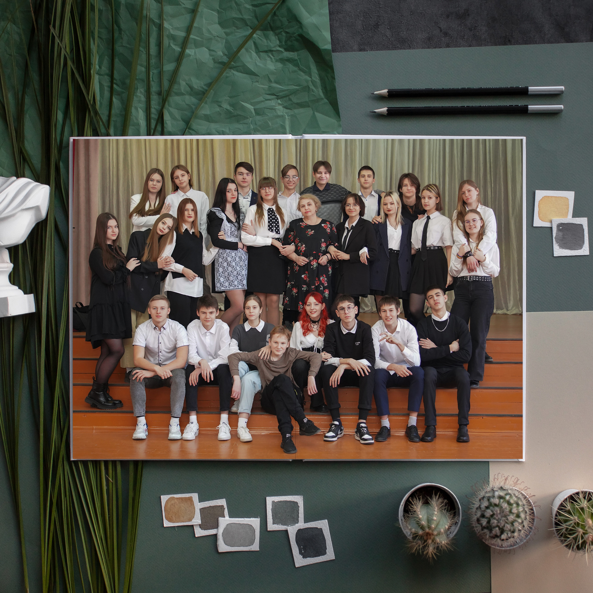 — ростовая групповая всего класса на весь разворот. И это возможно, только с разворотом страниц на 180 градусов.