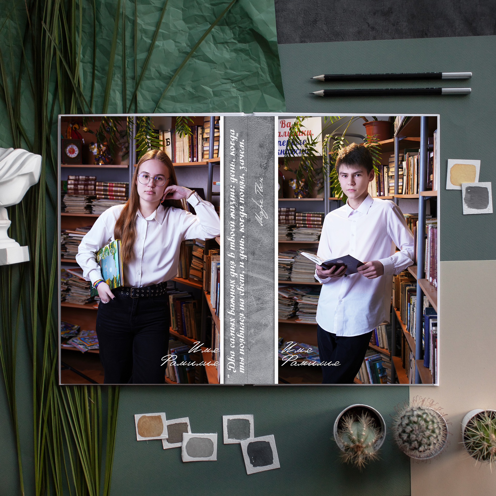 — два индивидуальных портрета крупным планом (в разных локациях), каждый портрет будет располагаться на отдельной странице заполняя ее полностью.